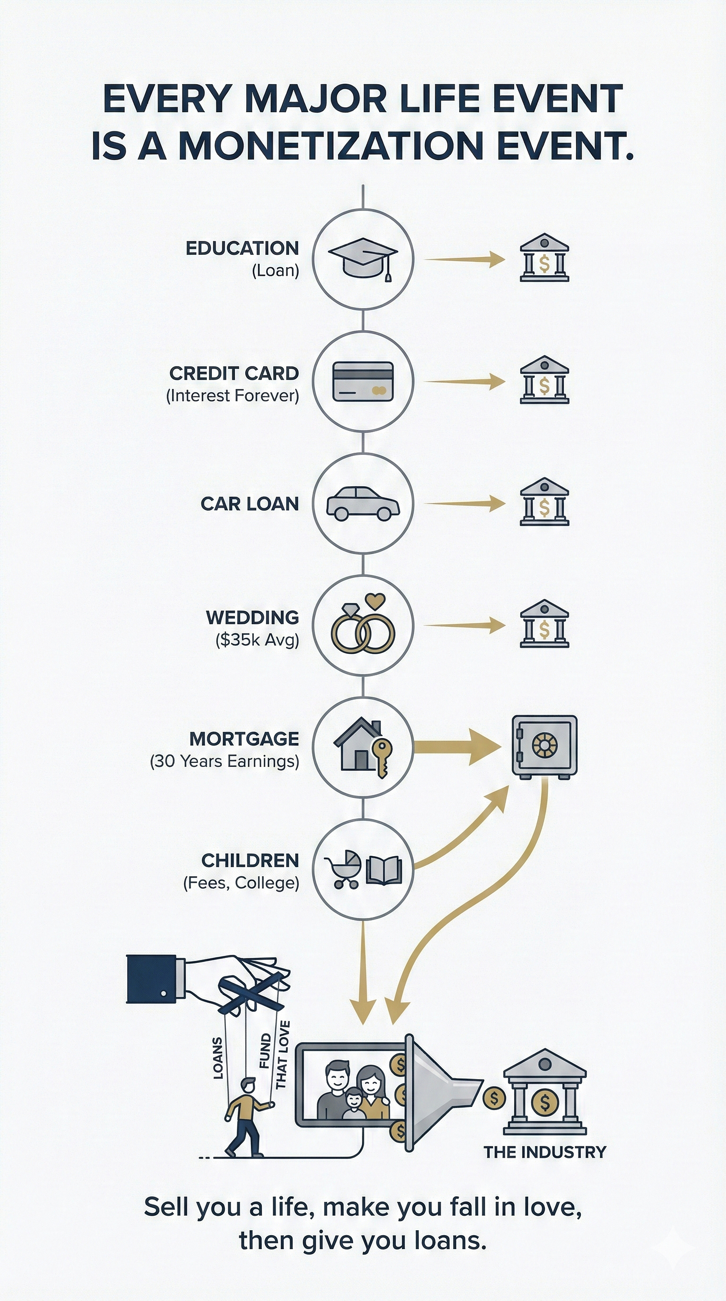“Let’s get them into university. Then make them buy a car. Then get them married with a loan. Then a mortgage. Then kids. Then more debt.”